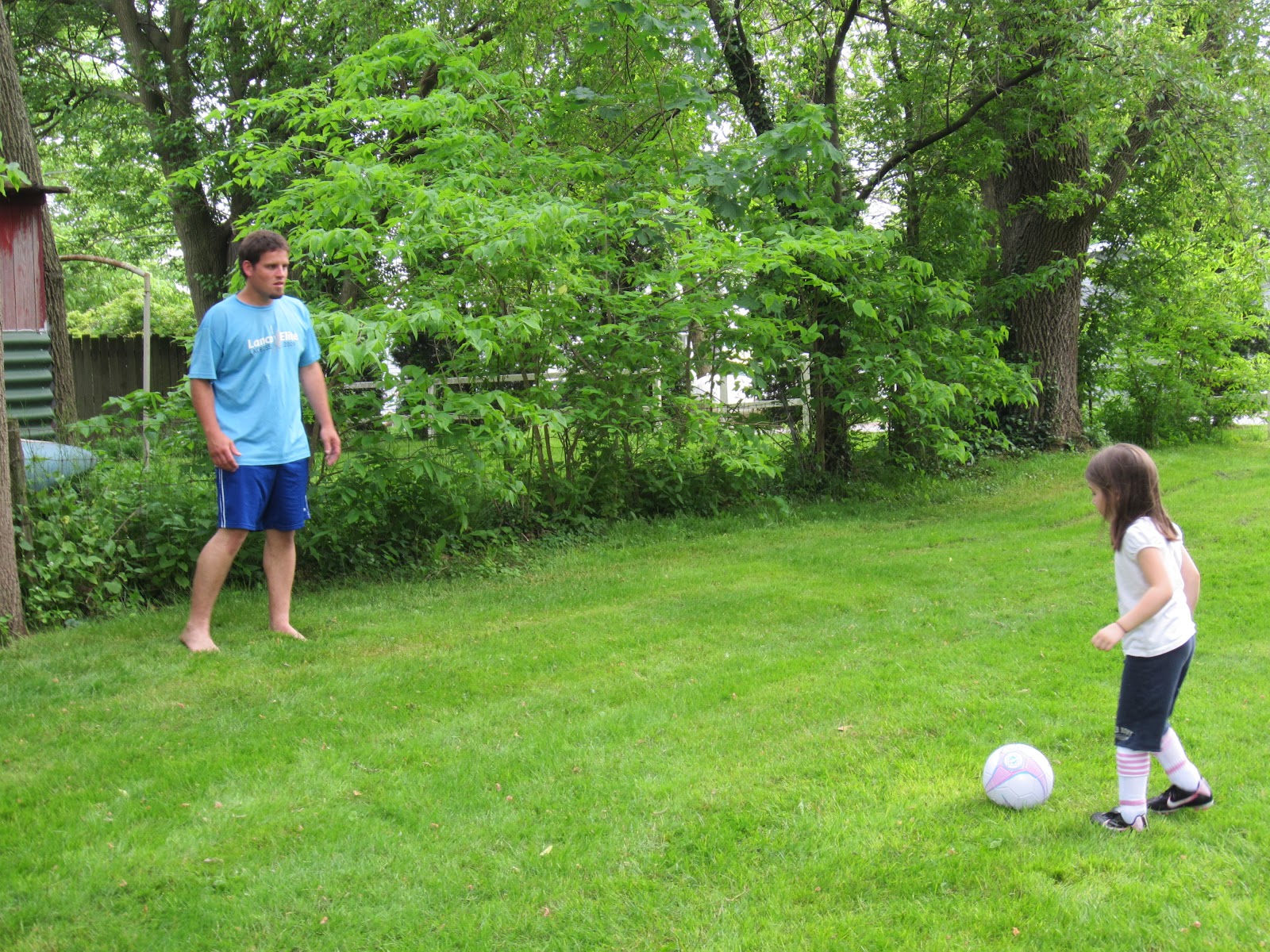 Bought her cleats, shin guards, socks, and a ball. She spent several afternoons in the back yard with her Daddy-O (who, in her mind, is a soccer pro after she spotted his trophies and senior soccer photo at Grandma's house), dribbling, practicing, and trying to keep away from her sporty little brother.